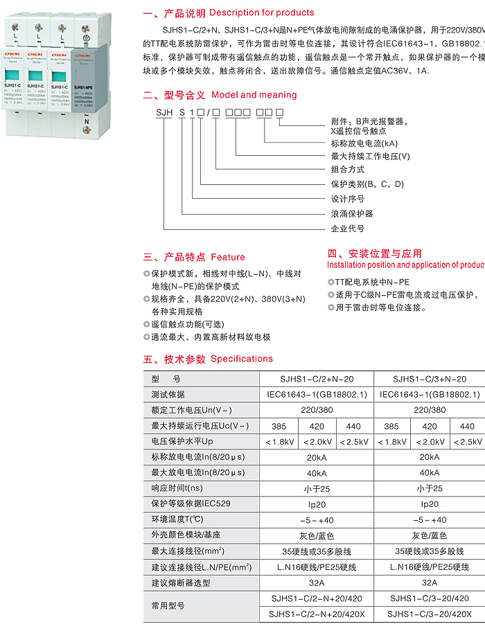 SJHS1-C/2+N、SJHSJ-C/3+N系列电源电涌保护器